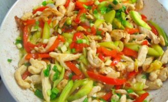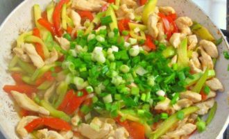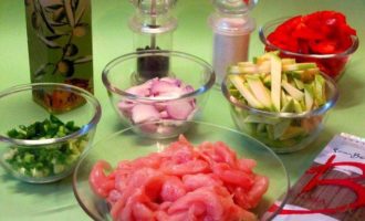 • Куриное филе вымыть, обсушить бумажным полотенцем, нарезать тонкими полосками. Перец и лук нарезать соломкой. Цукини нарезать брусочками, 4 стебля зеленого лука мелко нарезать.