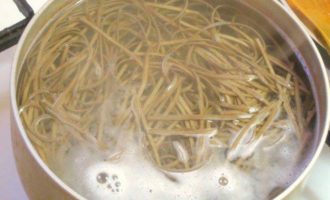 • Отварить собу 4 минуты, откинуть на дуршлаг, выложить, влить соевый соус.