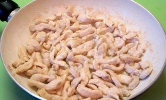 • На сковороде разогреть растительное масло, обжарить куриные полоски.