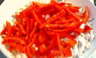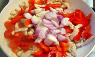 • Выложить перец, слегка обжарить.