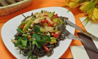 • Разложить собу по тарелкам, сверху выложить курицу с овощами.