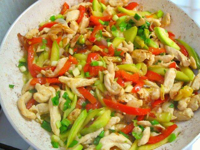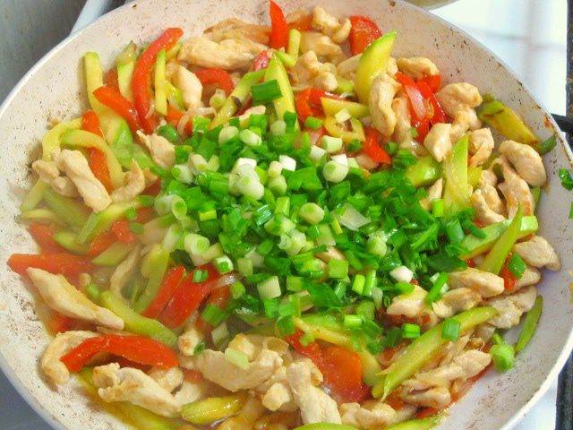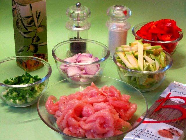 • Куриное филе вымыть, обсушить бумажным полотенцем, нарезать тонкими полосками. Перец и лук нарезать соломкой. Цукини нарезать брусочками, 4 стебля зеленого лука мелко нарезать.