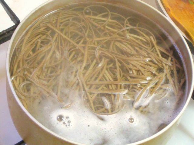 • Отварить собу 4 минуты, откинуть на дуршлаг, выложить, влить соевый соус.