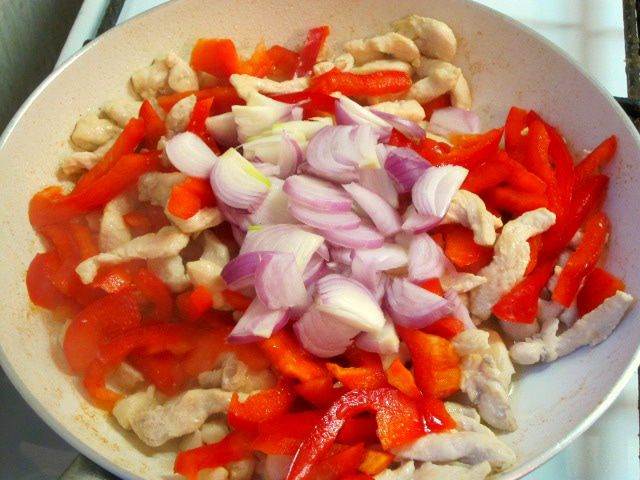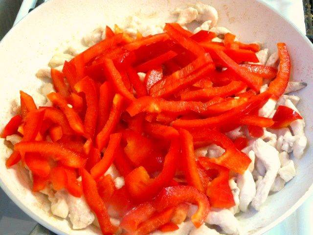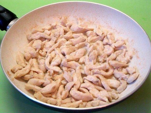 • На сковороде разогреть растительное масло, обжарить куриные полоски.