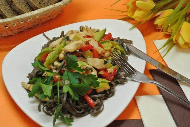 • Разложить собу по тарелкам, сверху выложить курицу с овощами.