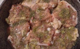 Куриные бёдра вымыть, обсушить бумажным полотенцем и выложить в смазанную растительным маслом форму для запекания кожицей вниз.