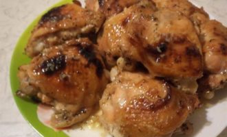 Смазать куриные бёдра медовой глазурью и запекать в духовке при температуре 190 градусов 35-40 минут, накрыв форму крышкой.