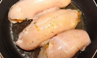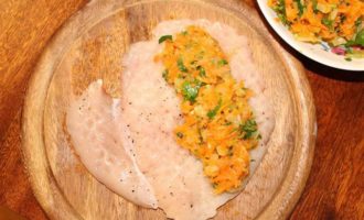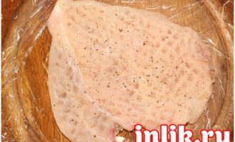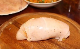 • Куриное филе разложите на доске и отбейте только со стороны среза. Добавьте соль и перец по вкусу.