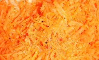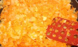 • Лук почистите и мелко нарежьте. Морковь натрите на крупной терке. В сковороде разогрейте растительное масло. Опустите в сковороду овощи.
