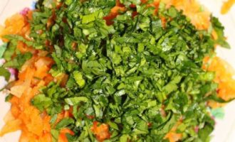 • Когда овощи протушились, выложите их в глубокую миску и остудите. Петрушку мелко порубите, добавьте к моркови с луком и перемешайте.