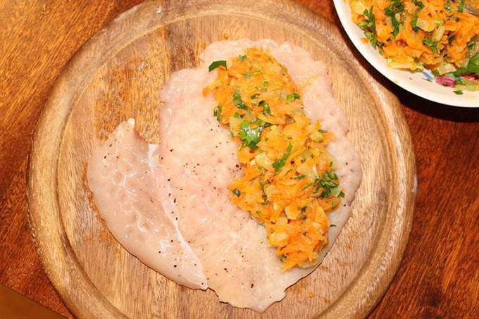 • Куриное филе разложите на доске и отбейте только со стороны среза. Добавьте соль и перец по вкусу.