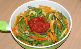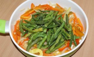 Вскипятить воду, подсолить воду и опустить нарезанную стручковую зеленую фасоль. Варить не больше 3 минут. Быстро откинуть фасоль на дуршлаг. Добавить к обжаренным овощам. Обжарить вместе 3 минуты.