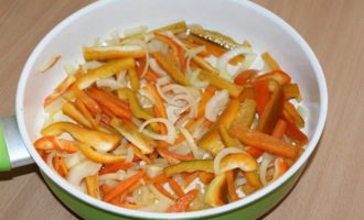 В сковороде хорошо прогреть масло, добавить нарезанный полукольцами лук, соломкой морковь и перец, жарить около 5 минут.