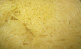 Отварите спагетти. Оставьте ее в состоянии «Al dente», чтобы паста была твердой. Слейте воду. -