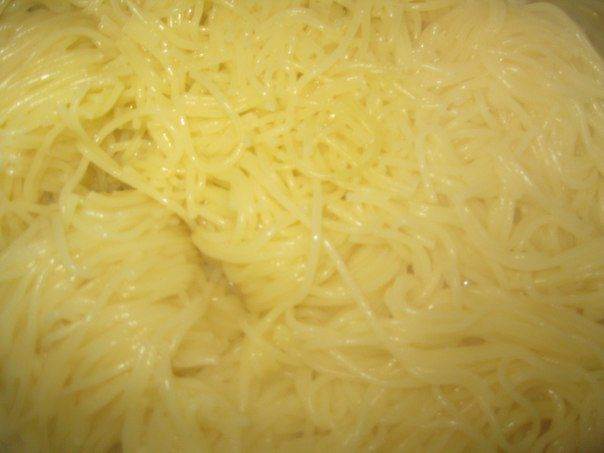 Отварите спагетти. Оставьте ее в состоянии «Al dente», чтобы паста была твердой. Слейте воду. -