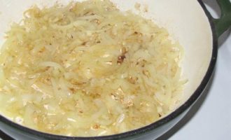 Лук нарезать четвертинками колец, чеснок измельчить. Разогреть в сковороде оливковое масло и обжарить лук и чеснок, пока лук не станет золотистым.