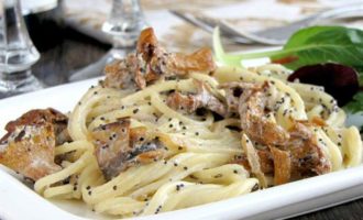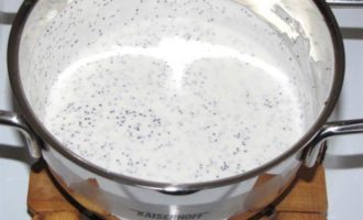 Засыпать спагетти в кипящую подсоленную воду и варить до готовности. Пока макароны варятся, смешать в маленькой кастрюльке сметану, сливки и мак. Немного прогреть.