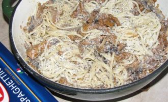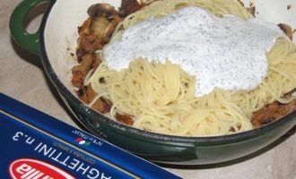 Выложить готовые спагетти в сковороду с грибами, добавить сметанный соус.