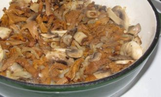 Параллельно поставить на огонь кастрюлю с водой. Пока вода закипает, добавить в сковороду сливочное масло и нарезанные грибы любые (у меня шампиньоны и лисички). Если грибы замороженные, то предварительно разморозить и отжать воду. Обжаривать грибы пока они не станут мягкими, примерно 5 минут.
