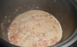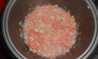 • Лук обжарить в режиме «Жарка» 5 минут. Добавить креветки, жарить на том же режиме еще 10 минут.