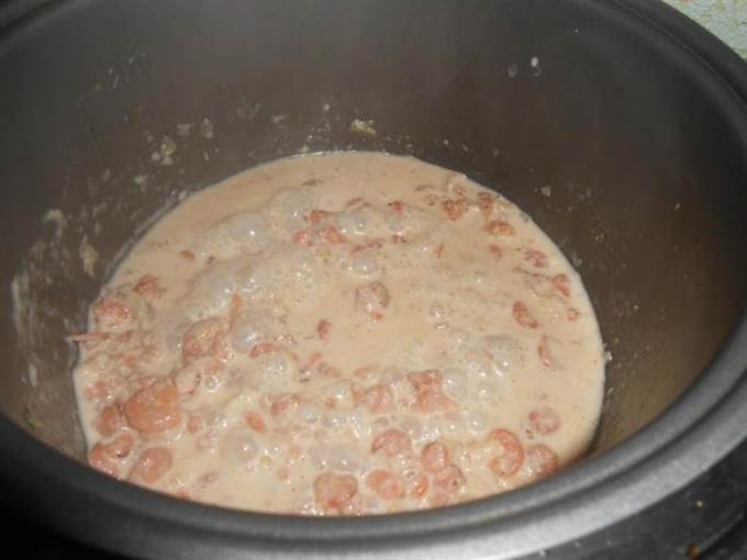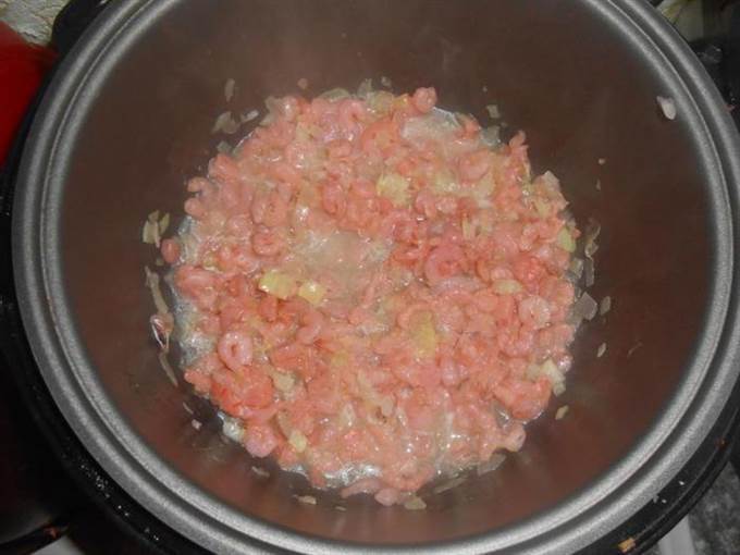 • Лук обжарить в режиме «Жарка» 5 минут. Добавить креветки, жарить на том же режиме еще 10 минут.
