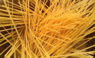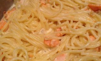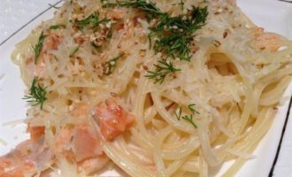 Выкладываем спагетти в тарелки, посыпаем сыром, укропом и кунжутом (кунжут обжарить).