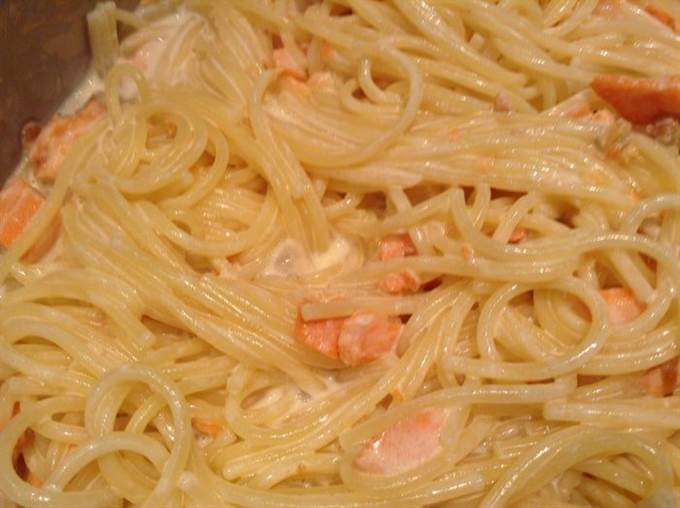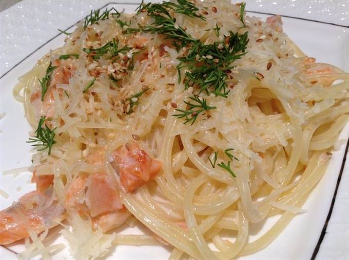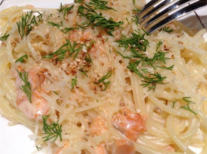 Выкладываем спагетти в тарелки, посыпаем сыром, укропом и кунжутом (кунжут обжарить).