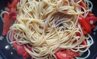 Вскипятите большую кастрюлю подсоленной воды. Поместите спагетти и варите по инструкции на упаковке, но на 2 минуты меньше. Откиньте спагетти на дуршлаг, сохранив стакан воды от варки. Спагетти переложите в сковороду к соусу.