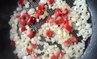 Насыпьте чеснок в большую сковороду с антипригарным покрытием, поставьте ее на средний огонь, добавьте оливковое масло. Жарьте, пока чеснок слегка не подрумяниться, затем положите в сковороду лук, перец, и жарьте еще 2-3 минуты. Затем добавьте помидоры и готовьте 10 минут.