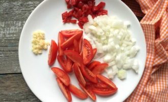Тонко нарежьте 4 зубчика чеснока, перец и лук, затем разрежьте помидоры на 4-6 частей.