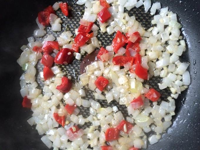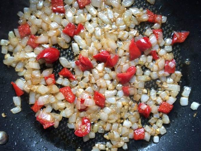 Насыпьте чеснок в большую сковороду с антипригарным покрытием, поставьте ее на средний огонь, добавьте оливковое масло. Жарьте, пока чеснок слегка не подрумяниться, затем положите в сковороду лук, перец, и жарьте еще 2-3 минуты. Затем добавьте помидоры и готовьте 10 минут.
