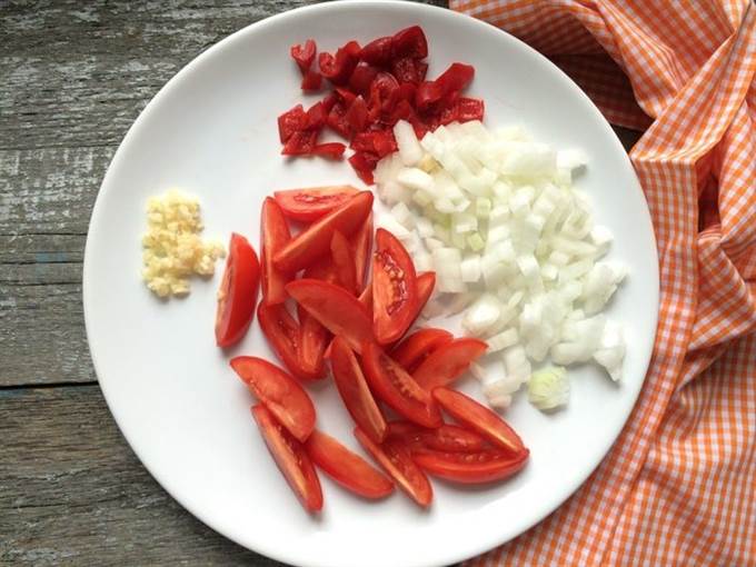 Тонко нарежьте 4 зубчика чеснока, перец и лук, затем разрежьте помидоры на 4-6 частей.
