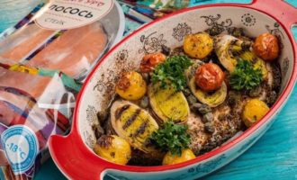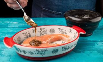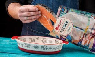 Стейк лосося ТМ «Магуро» размораживаем и моем. Разогреваем духовку до 220°С. Форму для запекания смазываем оливковым маслом, выкладываем рыбу.