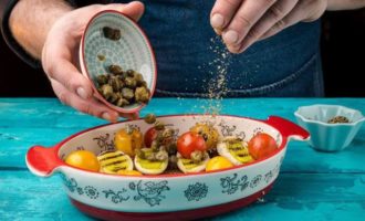 На сковороде-гриль обжариваем помидоры черри и нарезанный лук порей. Кладем рядом со стейком помидоры с луком, добавляем каперсы. Посыпаем майораном.
