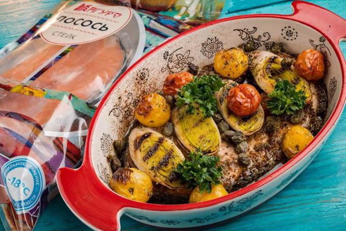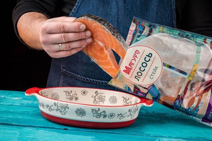 Стейк лосося ТМ «Магуро» размораживаем и моем. Разогреваем духовку до 220°С. Форму для запекания смазываем оливковым маслом, выкладываем рыбу.
