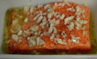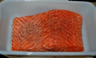 Выложить стейки семги в блюдо со стенками. Посолить и поперчить.