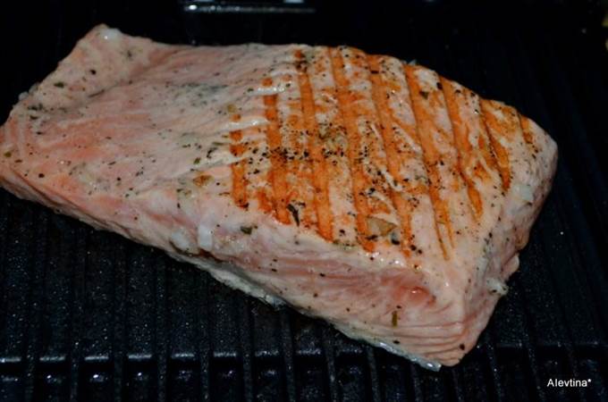 Подготовим гриль, смажем маслом прутья. Выложим семгу в маринаде на домашний гриль. Обжариваем на гриле, если нет гриля в духовке при температуре 200 градусов до готовности.