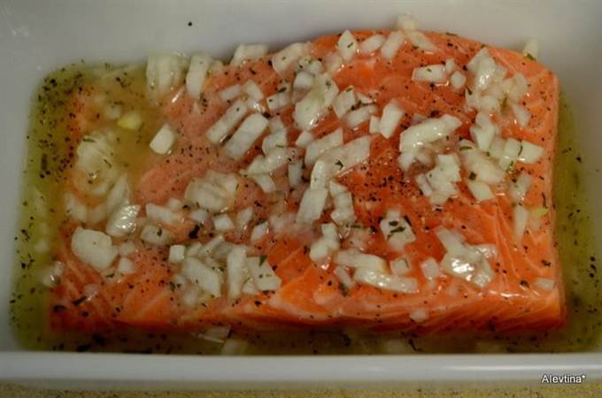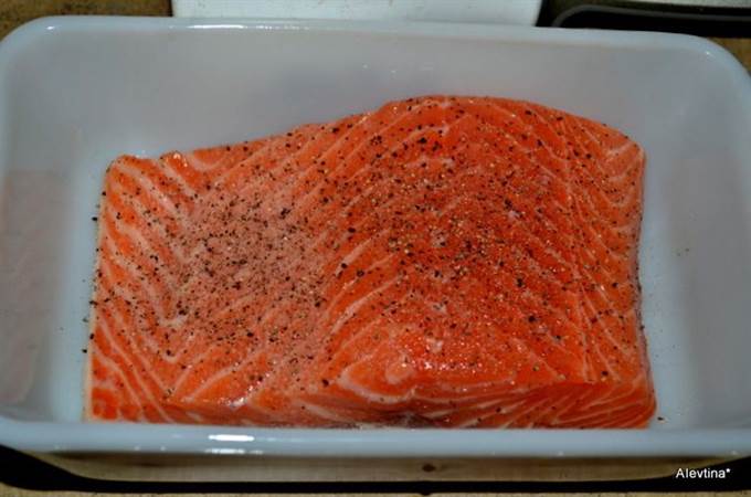Выложить стейки семги в блюдо со стенками. Посолить и поперчить.