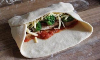 Завернуть короткие края теста на начинку, а затем по длинной стороне свернуть рулет.