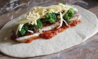 Тесто разделить на 4-8 частей и каждую раскатать в тонкую овальную лепёшку. Середину лепёшки смазать 1 ст. л. томатной пасты, сверху выложить кусочки курицы и ещё немного пасты. Затем-лук, на лук-брокколи и базилик. Пармезан натереть на крупной тёрке и присыпать им начинку.