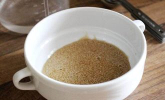 В миске смешать дрожжи с мёдом (или заменить на сахар) и залить тёплой (40°С) водой. Убрать миску в тёплое место на 5 минут, пока смесь не вспенится.