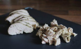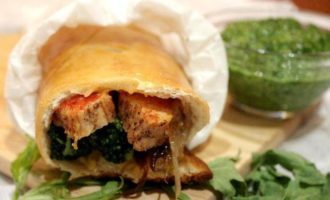 Тем временем подготовить начинку. Куриное филе смазать соусом песто, посолить, поперчить и обжарить до готовности.
