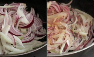 Лук нарезать на тонкие дольки. В сковороде разогреть оливковое масло, добавить лук, соль и перец. Довести лук до мягкости. Затем добавить коричневый сахар и потомить лук ещё минут 7.