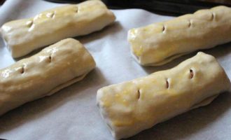 Стромболи уложить швом вниз на противень, застеленный пергаментом, смазать смесью желтка с молоком и сделать несколько небольших надрезов. Выпекать при 180°С около 25 минут.
