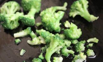 Убрать лук из сковороды и добавить свежие соцветия брокколи и минут 5-7 их тушить. Если капуста мороженная, достаточно её просто разморозить и не обжаривать.