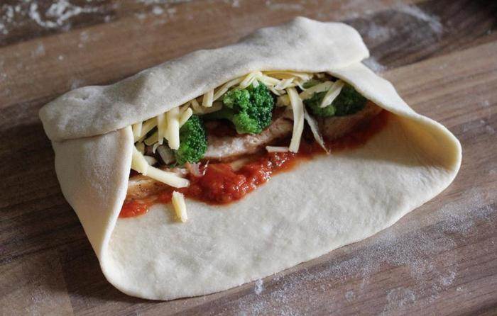 Подавать стромболи горячими с томатным соусом или с песто из рукколы. Для песто взбить в блендере 50 г рукколы, 25 г пармезана, 2 зубца чеснока, горсть очищенного миндаля, соль и 2-3 ст. л. оливкового масла.