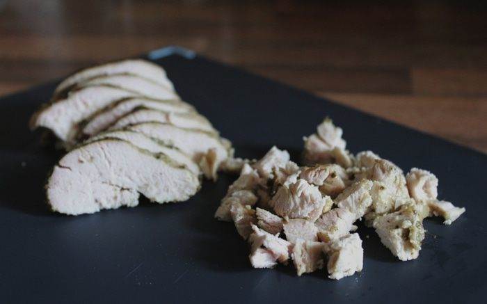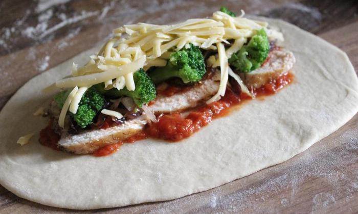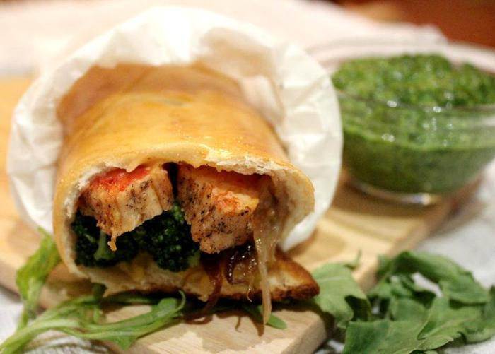 Тем временем подготовить начинку. Куриное филе смазать соусом песто, посолить, поперчить и обжарить до готовности.