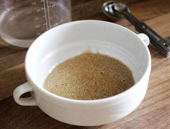 В миске смешать дрожжи с мёдом (или заменить на сахар) и залить тёплой (40°С) водой. Убрать миску в тёплое место на 5 минут, пока смесь не вспенится.