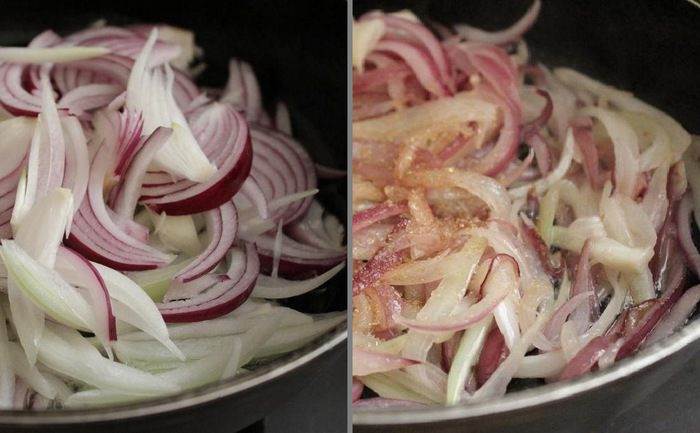 Лук нарезать на тонкие дольки. В сковороде разогреть оливковое масло, добавить лук, соль и перец. Довести лук до мягкости. Затем добавить коричневый сахар и потомить лук ещё минут 7.