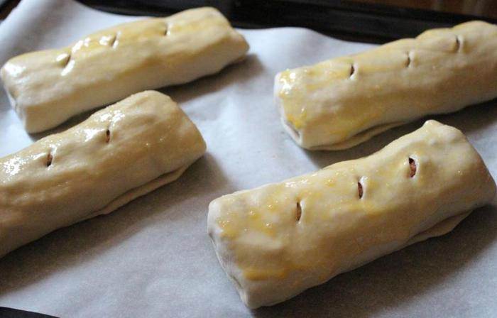 Стромболи уложить швом вниз на противень, застеленный пергаментом, смазать смесью желтка с молоком и сделать несколько небольших надрезов. Выпекать при 180°С около 25 минут.